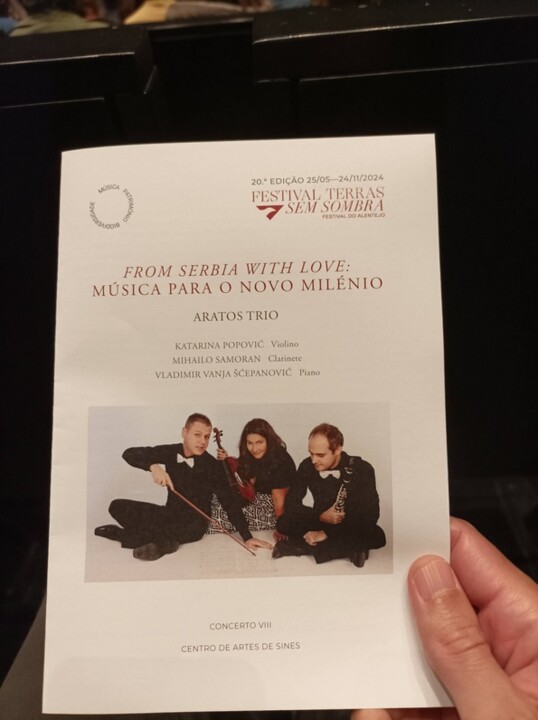 No fim de semana fui ver o Aratos Trio ao Centro de Artes de Sines. Um trio sérvio de música de câmara composto por clarinete, violino e piano. Concerto incorporado na 20ª edição do festival Terras Sem Sombra, que está a decorrer pelo Alentejo. Foi um fim de semana calmo. Após o concerto rumei a casa e no Domingo pouco fiz, passando o dia todo com uma excedente moleza.